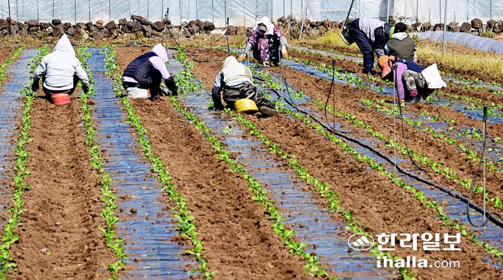 [한라일보] 23일 제주시 조촌읍 신촌리 한 농가에서 농민들이 따스한 봄볕을 맞으며 모종 파종작업을 하고 있다. 강희만기자