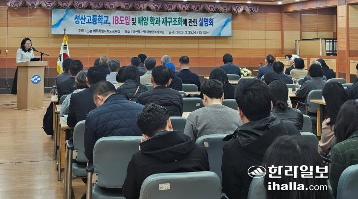 제주특별자치도교육청은 25일 오후 성산포수협 복지회관에서 '성산고 국제 바칼로레아(IB) 도입 및 해양학과 재구조화 설명회'를 열고 이 같은 결정을 공개했다. 한 학년에 일반과와 특성화과(해양산업과)를 2학급씩 운영하는 기존 체제를 유지하되, 일반과에 IB 고교 과정을 도입하고 특성화과를 재구조화하겠다는 것이다. 이날 설명회는 성산고 체제 개편 유형이 최종 결정된 이후에 처음 마련된 자리다.