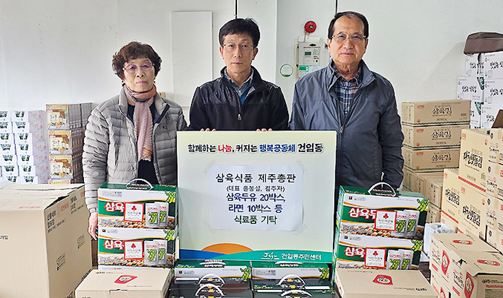 삼육식품 제주총판(대표 윤봉실·김추자)은 25일 제주시 건입동 내 취약계층의 건강한 식생활을 돕기 위해 건강두유 20박스와 라면 10박스(총 50만원 상당)를 건입동주민센터(동장 김미성)에 전달했다.