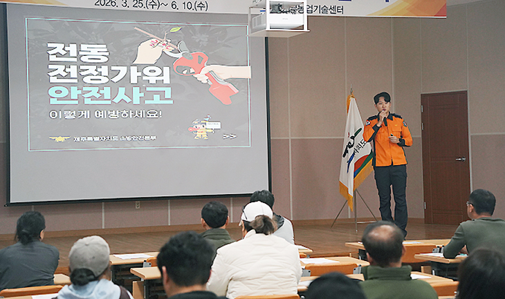[한라일보] 제주도소방안전본부(본부장 박진수)와 제주도농업기술원 서부농업기술센터는 25일 신규 영농인 30명을 대상으로 전정·정지 작업 안전교육을 실시했다. 이와 연계해 119구급대원이 참여한 응급처치 교육도 함께 진행됐다.
