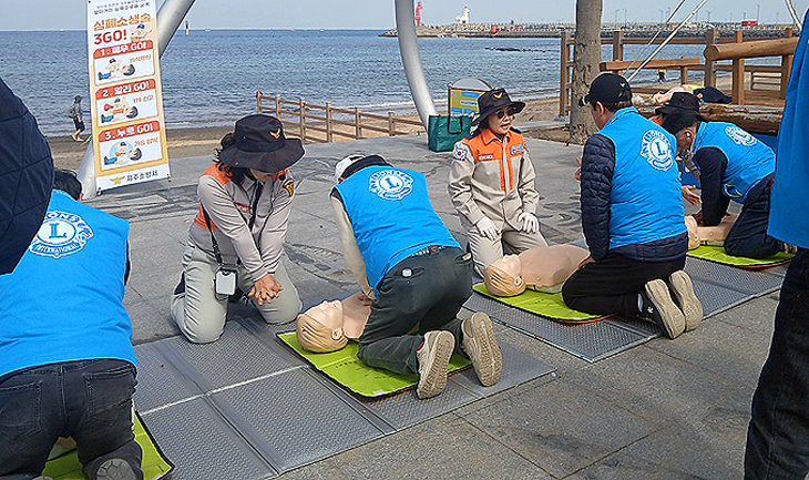 제주소방서 오라의용소방대(대장 이창열·김선금)는 지난 22일 이호해수욕장 야외무대에서 제주드림 라이온스클럽 회원을 대상으로 응급처치교육을 실시했다.