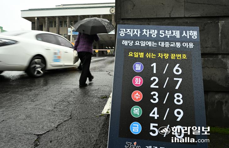 [한라일보] 공공기관 차량 5부제 시행 첫날인 25일 제주시 연동 제주특별자치도청 정문에 안내판이 설치돼 있다. 강희만기자