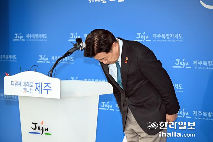 [한라일보] 오영훈 제주지사가 26일 제주자치도청 기자실에서 기자회견을 갖고 최근 불거진 정무라인 공무원들의 관권선거운동 의획에 대해 사과하고 있다. 오 지사는 지방선거 개입 의혹을 받는 정무라인 공무원들에 대해 수사의뢰하겠다고 밝혔다. 강희만 기자