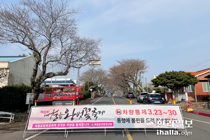 마찬가지로 오는 28일부터 축제를 개최하는 제주시 애월읍 장전리의 왕벚꽃거리도 비슷한 상황이었다. 차량통제가 현수막이 내걸리고 각종 포토존도 설치됐지만 정작 주인공인 벚꽃은 찾아볼 수 없었다.
