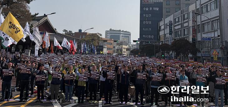 지난 28일 제주시 관덕정 앞에서 열린 민주노총이 주최한 '4·3민중항쟁 78주년 정신계승 전국노동자대회'에서 참가자들이 구호를 외치고 있다.