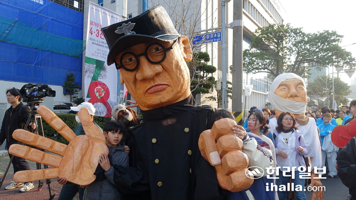 행렬 중간에는 4·3 당시 민간인 학살을 막아 수백명의 목숨을 구한 고(故) 문형순 경찰서장과 ‘무명천 할머니’로 잘 알려진 진아영 할머니를 캐릭터화 한 인형탈을 쓴 참가자도 있었다.