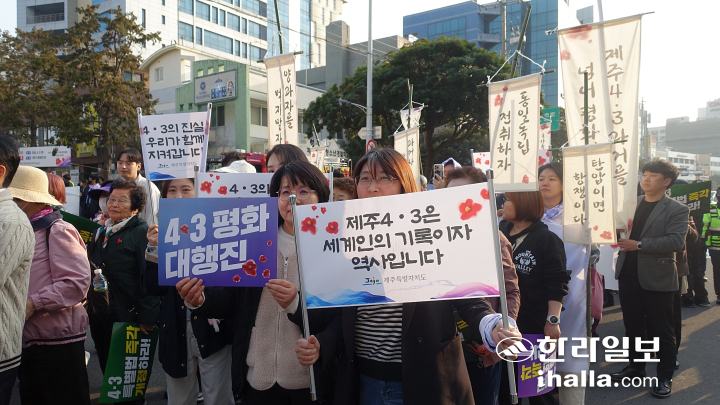 [한라일보] 제78주년 4·3희생자 추념일을 하루 앞둔 2일 오후 제주시 이도2동 광양사거리. 스카프를 두른 백발의 노인과 앳된 얼굴의 대학생이 나란히 걸었다. 그 뒤로는 “탄압이면 항쟁이다”, “4·3 왜곡 중단하라” 등이 적힌 깃발이 바람에 세차게 펄럭였다.