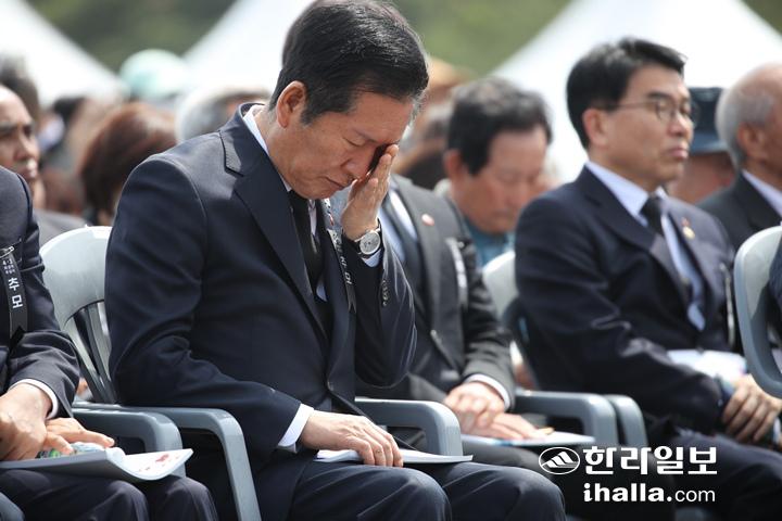 제주4·3추념식에서 눈물 훔치는 정청래 대표