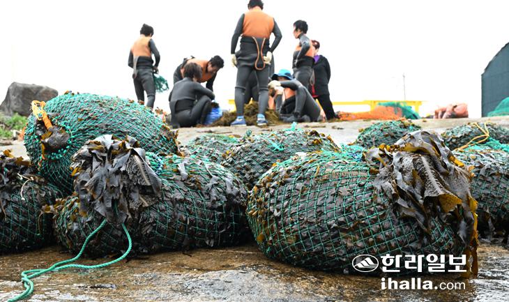 [한라일보] 6일 제주시 한림읍 수원리 해안가에서 해녀들이 미역을 수확해 뭍으로 끌어 올렸다.