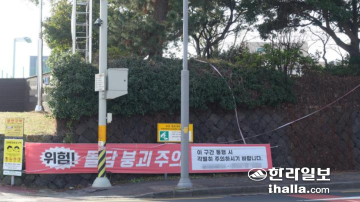 | 지난달 5일 제주시 모 중학교 앞 돌담에 '위험! 돌담 붕괴 주의' 현수막이 걸려 있다. 양유리기자 |