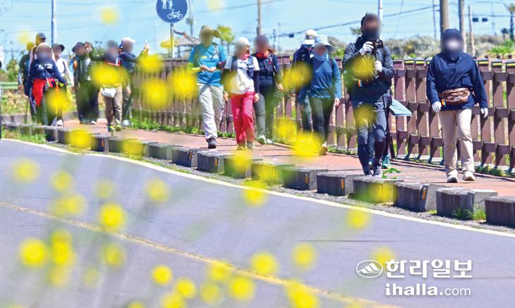 [한라일보] 완연한 봄 날씨가 이어진 7일 제주시 구좌읍 종달리 해안을 찾은 한 무리의 올레꾼들이 담소를 나누며 걸어가고 있다.