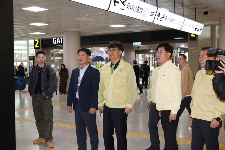 | 제주도가 9일 강풍에 따른 재난안전대책본부 비상 1단계 근무에 돌입한 가운데, 박천수 제주도지사 권한대행이 제주국제공항을 찾아 항공기 운항 현황과 이용객 안전대책을 점검했다. 제주도 제공 |