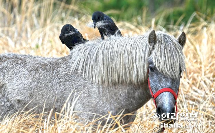 [한라일보] 12일 서귀포시 대정읍 송악산에서 번식기를 맞은 큰부리까마귀 한 쌍이 방목 중인 조랑말 등에 올라타 둥지재료로 사용할 털을 뽑고 있다.