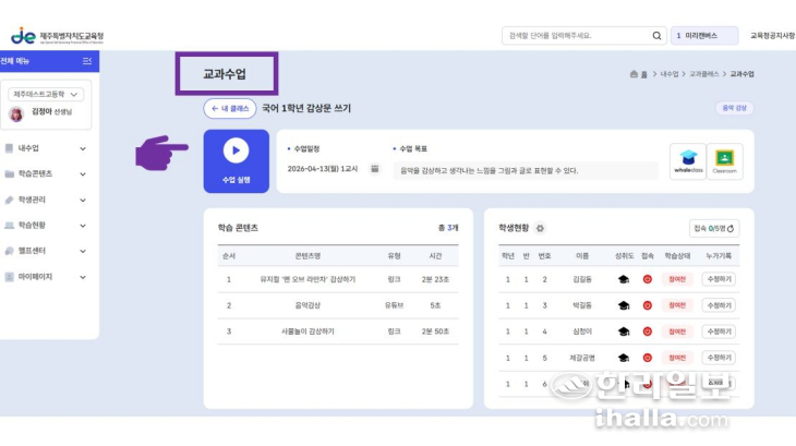 [한라일보] "국어 1학년 '감상문 쓰기'라는 수업이 1교시에 개설돼 있습니다. 그 밑을 보면 우리 반 학생의 접속 상태가 어떤지 확인할 수 있고, 과제부터 토론, 묻고 답하기 등 게시판도 구성돼 있습니다."