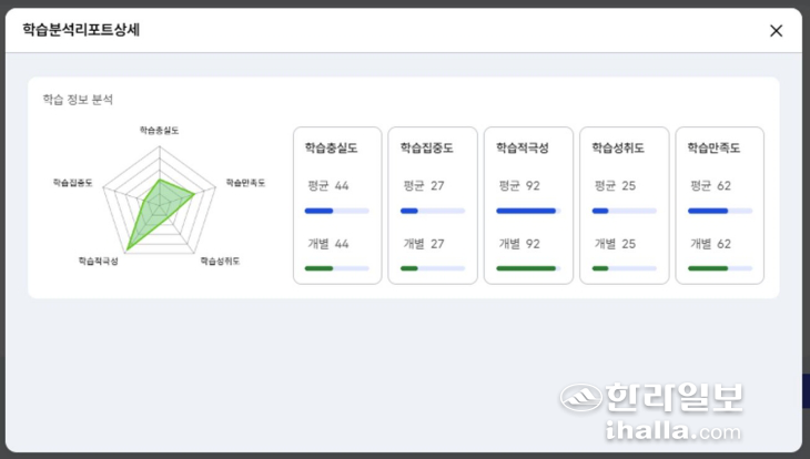 플랫폼 '바당'이 제공하는 학습분석리포트. 이처럼 교사는 학생의 학습 충실도와 집중도, 적극성, 성취도, 만족도가 담긴 학습분석리포트를 도표와 개별 점수로 확인할 수 있다. 제주도교육청 제공
