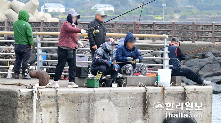 [한라일보] 13일 제주시 구좌읍 세화항 포구를 찾은 사람들이 봄 날씨 속에서 낚시를 즐기고 있다.