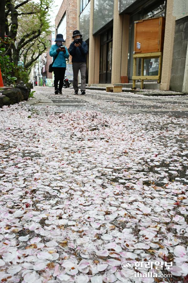 [한라일보] 13일 제주시 삼도1동 왕벚꽃거리 인도에 떨어진 벚꽃잎이 마치 눈처럼 하얗게 쌓여 있다.