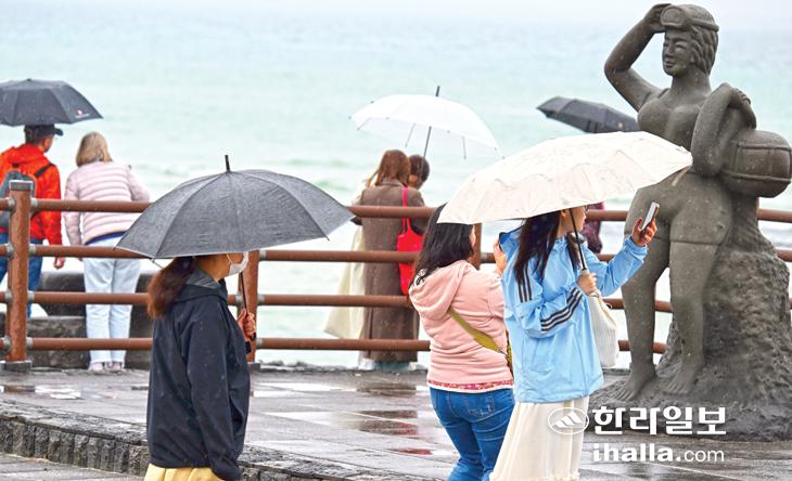 [한라일보] 봄비가 내린 14일 제주시 한림읍 협재해수욕장을 찾은 관광객들이 우산을 쓴채 사진을 찍고 있다.