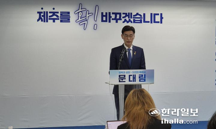 문 후보는 15일 제주시 노형동 선거사무소에서 기자회견을 열고 "상인, 농어민, 소상공인, 청년, 중장년까지 도민 모두가 '제주를 확 바꿔달라는' 같은 목소리를 내고 있다"며 "도정의 연장이 아닌 완전히 새로운 도정을 열어야한다는 요구가 분명하다"고 밝혔다.