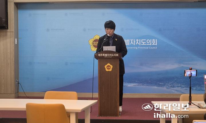15일 제주도의회 도민카페에서 기자회견을 열고 있는 홍인숙 의원. 김채현기자