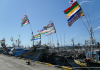 제주도 서귀포시 성산포항에 정박중인 어선들에 달린 만선기가 바람에 펄럭이고 있다. …