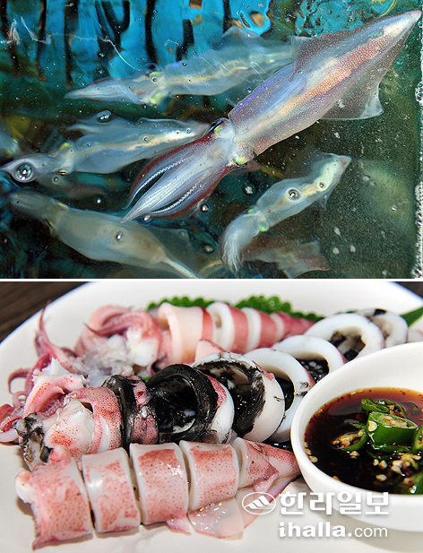 | ▲물회 재료인 한치가 수족관에 들어찼다(사진 위). 한치를 통째로 삶아낸 먹통한치(가운데) |