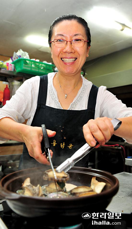 "홍어삼합에서 착안해 냈다. 입맛이 까다롭지만 음식에 관심이 많은 남편이 홍어 대신 제주의 진품인 전복을 곁들여보면 어떨까 하며 식당을 차리기 전에 개발해낸 음식이 전복 삼합이다. 맛과 영양이 만점인데다 남녀노소 누구나 좋아하니 관광객들에게도 먹히겠다 싶었다. 전문가에게 물었더니 전복 삼합의 음식궁합도 괜찮다고 해 자신감을 얻었다." 강씨의 말이다.