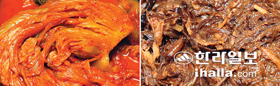 | ▲사진 왼쪽은 조리되기 전의 묵은지. 김치찜은 물론 고등어조림의 주재료다. 사진 오른쪽은 찧은 고사리. 한층 부드러워져 국물맛을 짙게 하는 효과를 낸다. |