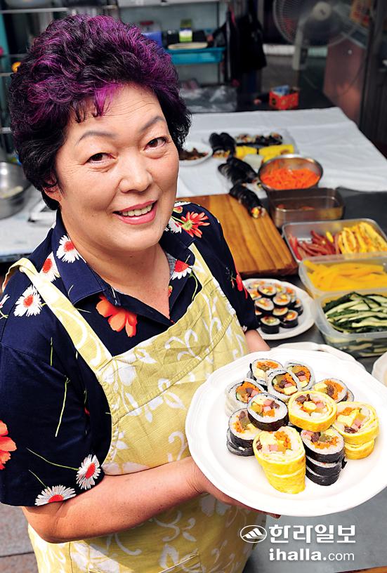 제주시 화북시장 안에 있는 '한동 김밥'도 김밥 하나로 승부를 거는 곳이다. 주인장은 "아이들 소풍날이면 김밥을 넉넉히 싸서 나눠먹곤 했는데, 주변으로부터 맛있다는 소리를 늘 듣곤 했다"는 김정순(58)씨다. 솜씨좋은 손맛을 살려 이 곳에서 김밥 장사를 시작한 게 올해로 딱 10년째다.