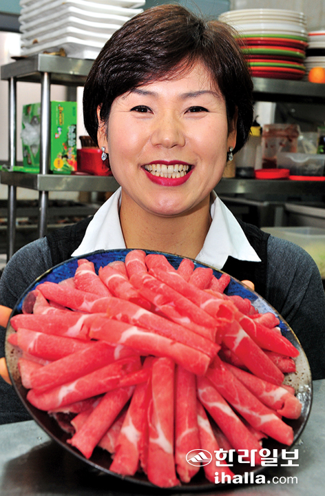 | ▲후년하우스 정윤정 대표가 샤브샤브용 말고기를 내보이며 활짝 웃고 있다. |