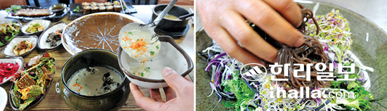 | ▲도토리들깨수제비로 진한 맛이 일품이다(사진 왼쪽). 주메뉴인 새싹쟁반국수. |