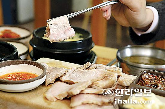 ▲쫄깃하고 담백한 맛이 그만인 흑돼지 돔베고기. 이현숙기자