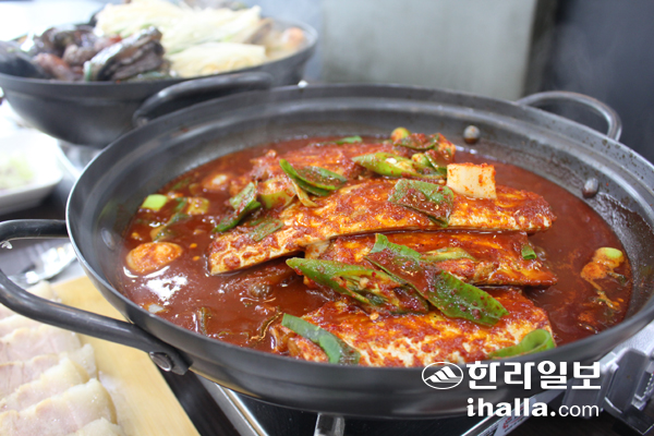 이 식당에는 갈치 요리에 버금가는 메뉴도 빼놓을 수 없다. 바로 해물탕이다. 이 집의 해물탕 냄비에는 제주 바다가 담겨 있다. 해물탕엔 홍합과 대합, 전복, 제주산 딱새우 등 제주바다에서 나는 해물이 푸짐하게 담긴다. 팔팔 끓는 해물탕 위에는 살아 움직이는 문어 한 마리가 통째로 올라간다. 이와 함께 갖은 채소류가 더해져 맛을 보기 전부터 입맛을 돋운다. 얼큰한 국물을 한수저 떠서 먹고 나면 코 끝에 땀이 송골송골 맺힌다. 이마에서는 굵직한 땀방울들이 내려오기 시작한다. 탄산음료 한잔 쭉 들이켜 놀란 위를 차갑게 달래고 어느새 빈 그릇에 남은 해물탕 국물을 '후루릅' 들이키고 있다.