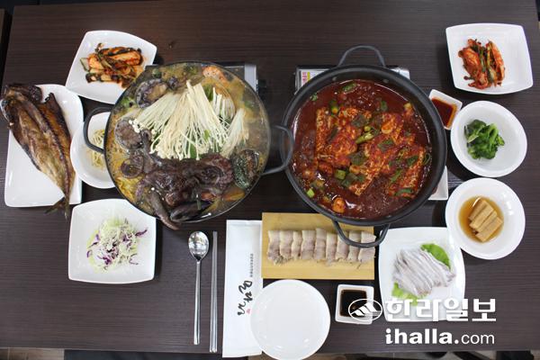 서귀포시 성산읍에 있는 향토음식점 '모다정'은 제주바다의 싱싱함을 담은 재료를 이용한 음식을 맛볼 수 있는 곳이다. 사진은 매콤한 갈치조림과 해물탕이 올라온 한상 차림.