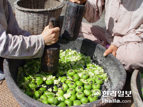집집마다 토종감이 있었을 무렵엔 저마다 감물을 들였다. 풋감을 따 큼지막한 그릇에 넣고 잘게 부숴 감즙을 낸 뒤 감물을 들여 햇빛에 말리는 과정을 거쳤다. 사진=서귀포시농업기술센터·제주민속촌 제공, 한라일보 DB
