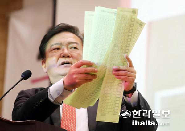 지난 11일 오후 서울 여의도 국회 의원회관에서 열린 4ㆍ15총선 의혹 진상규명과 국민주권회복 대회에서 미래통합당 민경욱 의원이 투표관리관의 날인 없이 기표되지 않은 채 무더기로 비례투표용지가 발견됐다고 주장하는 모습.연합뉴스