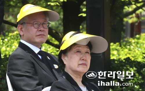 지난 23일 경남 김해 봉하마을에서 열린 노무현 전 대통령 11주기 추도식에 이재명 경기도지사가 노무현재단 초대 이사장을 지낸 한명숙 전 국무총리와 함께 앉아 노 전 대통령을 추모하고 있다. 연합뉴스