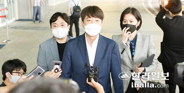 7일 오후 제8회 국제전기자동차엑스포 개막식 참석차 제주를 방문한 국민의힘 이준석 대표가 행사장인 제주국제컨벤션센터(ICC) 입구에서 지역 기자들을 상대로 기자회견을 하고 있다. 이상국 기자