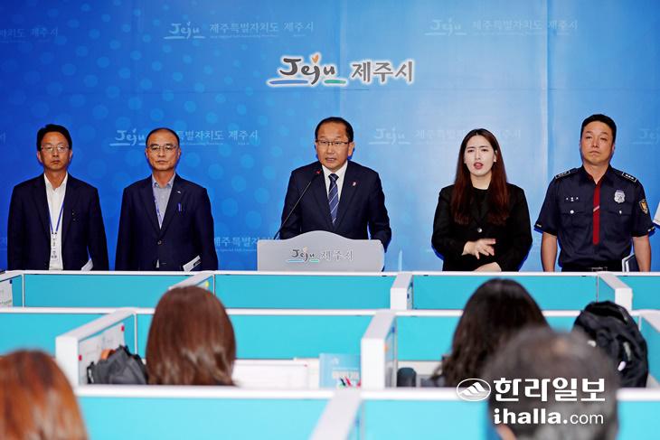 취임 1주년을 맞은 강병삼 제주시장이 23일 제주시청 기자실을 찾아 임시 개통한 제주공항 지하차도 교통 체계 안정화 등을 내용으로 브리핑하고 있다. 제주시 제공
