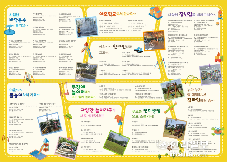 놀이터의 테마를 크게 '숲놀이터', '물놀이터', '책놀이터', '예술놀이터' 4가지로 구분한 것도 눈길을 끈다. 전주시가 펴낸 놀이터 지도에는 '짚라인을 탈 수 있는 놀이터', '인라인을 탈 수 있는 놀이터', '잔디광장이 있는 놀이터'처럼 더 세세한 안내가 담겨 있다. 놀이터마다 특색을 더해 아이와 부모가 골라 찾아갈 수 있도록 한 것이다.