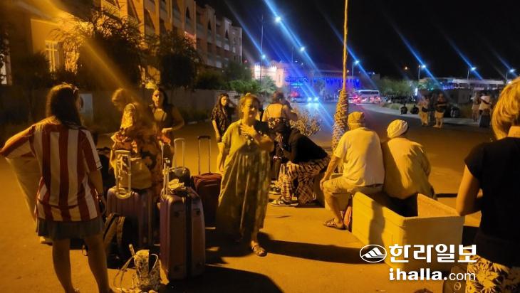 모로코 현지 시각으로 9월 8일 밤 11시 11분쯤 규모 6.8의 강진이 발생하자 긴급히 대피한 호텔 투숙객들.
