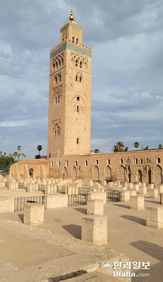 마라케시의 상징 쿠투비아 모스크. 제마알프나 광장 외곽에 있는 모스크로 77m 높이의 뾰족한 첨탑은 광장 어디에서나 볼 수 있다. 강진 하루 전 모스크. 이 모스크 첨탑 일부가 이번 강진으로 피해를 본 것으로 알려져 있다. 사진=강시영