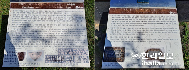 [한라일보] 대규모 주택단지가 들어선 제주시 삼화지구 내에 위치한 선사유적 재현장에 대한 관리가 엉망이다. 특히 안내판은 퇴색해 내용을 제대로 알 수 없고, 유리시설을 갖춘 재현장에는 물이 고여 썩은 데다 테두리를 두른 판석은 떨어져나가 관람시 안전상의 문제도 갖고 있어 정비가 시급한 상황이다.