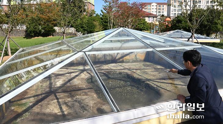 제주시 삼화지구 내에 있는 선사유적 재현장이 관리 부실로 유리시설 내부에 물이 고여 썩고 있어 조속한 문제 해결 및 체계적 관리가 시급하다. 이상국기자