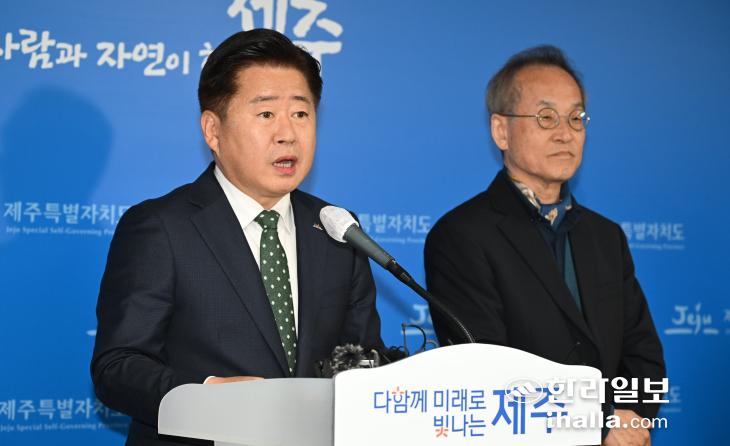 오영훈 제주도지사와 최재천 이화여대 석좌교수가 13일 제주도청 기자실에서 '생태법인 제도 도입 제주특별법 개정' 공동회견에서 발언하고 있다. 이상국기자