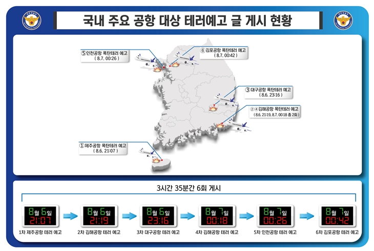 A씨가 제주공항을 시작으로 불과 3시간 35분 사이 김해, 대구, 인천, 김포공항에 대한 테러 예고글을 순차적으로 올리면서 해당 공항에서 대대적인 수색이 이뤄지는 등 큰 소동이 빚어졌다.