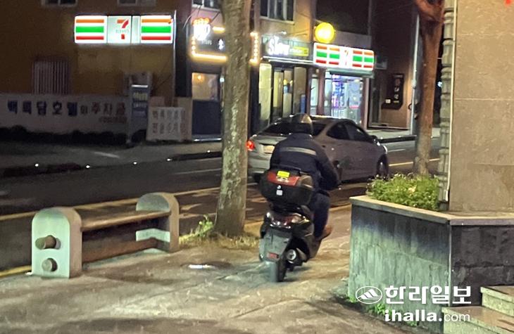지난 12일 오후 8시 제주시청 인근의 한 도로. 배달 오토바이 한 대가 차도를 달리다가 신호에 걸리자 그대로 인도 위를 향해 질주했다.