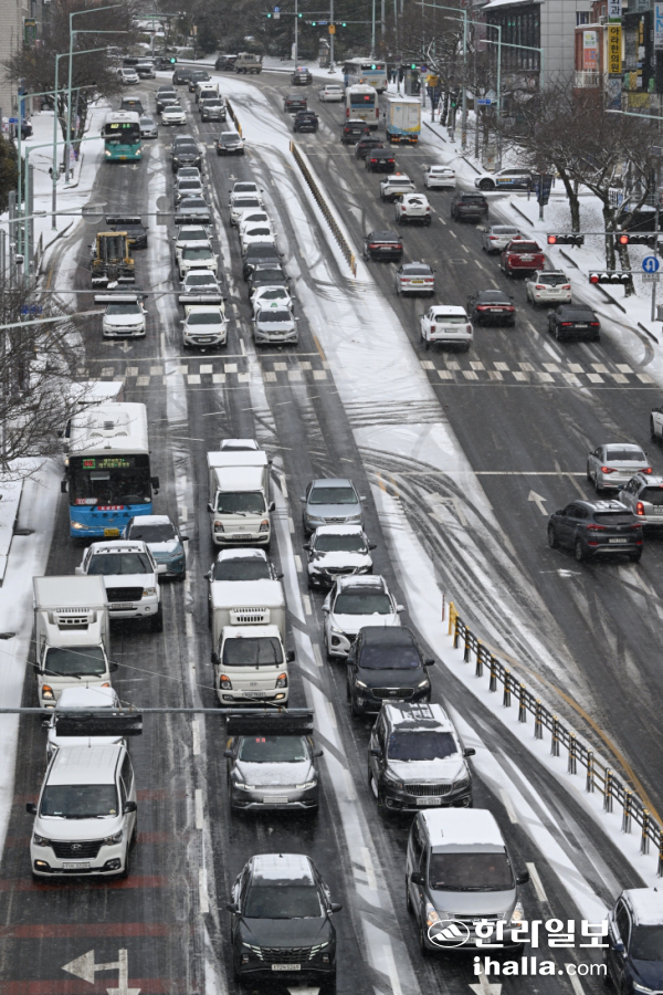 도심지인 제주시 아라동 일대와 연북로와 일부 해안 지역의 도로에서도 눈이 쌓이거나 내린 눈이 얼어붙어 차량이 거북이 운행을 하고 있다.
