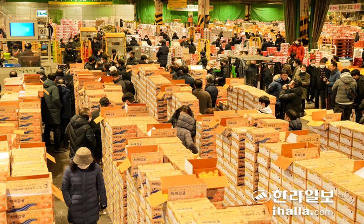 서울 농산물도매시장 감귤 경매. 한라일보DB