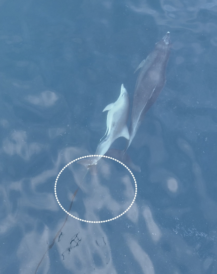 28일 서귀포시 대정읍 일과리 바다에서 어미와 함께 바닷속을 유영하는 새끼 남방큰돌고래 꼬리 쪽에 어민들이 버린 것으로 추정된 그물이 감겨 있었다. 제주대학교 돌고래연구팀·다큐 제주 제공
